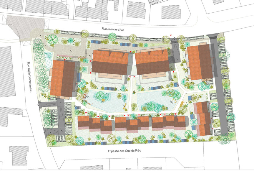 Un espace public statutaire ouvert sur la ville versus un cœur d’îlot végétal privé visible depuis l’espace public vient créer une connexion particulière entre la rue historique et le projet, hiérarchisant les usages et l’intimité.